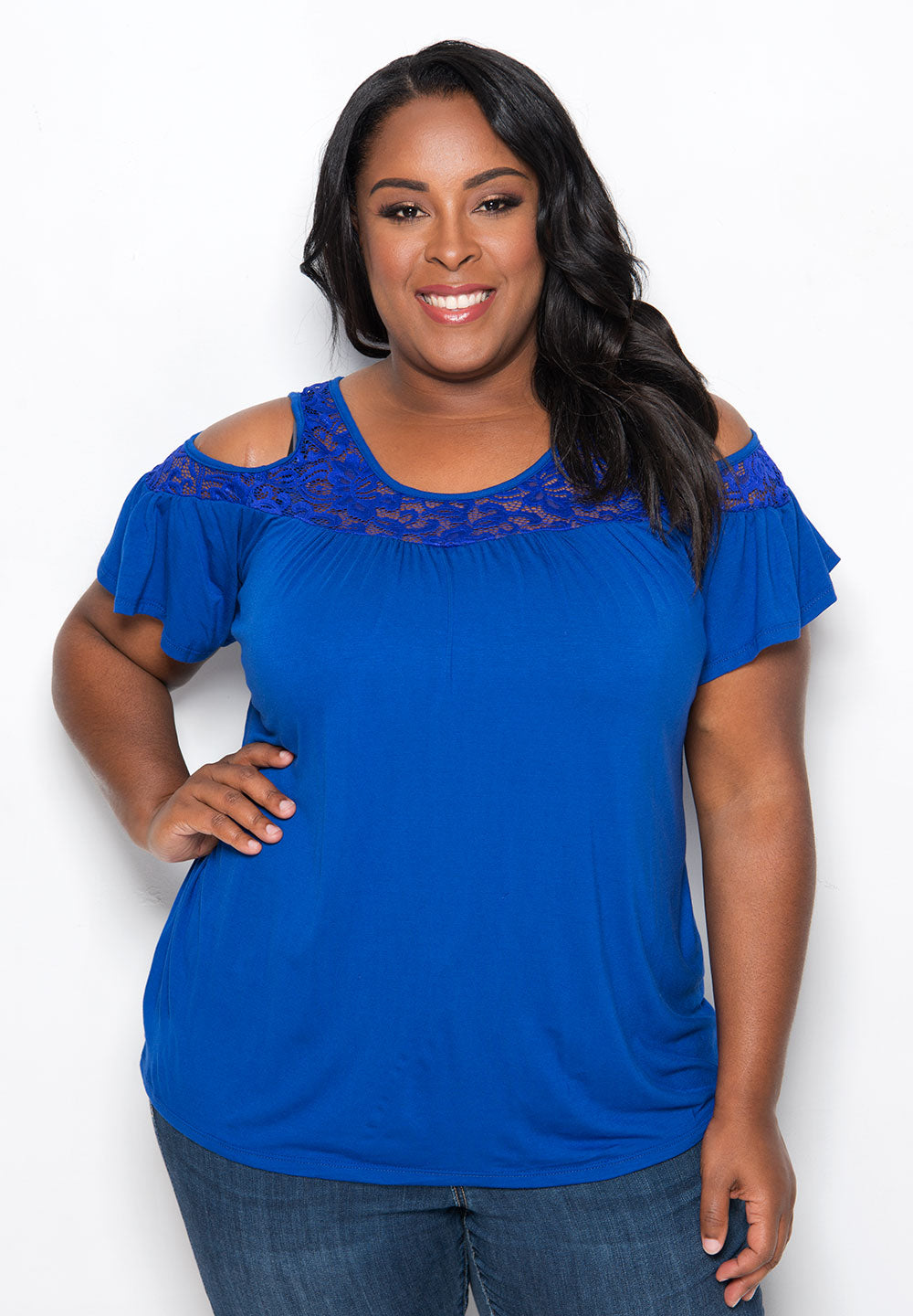 A classic pull-on plus size top with pretty lace touches and open shoulders. It's perfect to pair with your favorite jeans or maxi skirt for a playful, evening look. Layer it with a cardigan for extra coverage or go bare! The perfect throw-on top for day-to-night style.